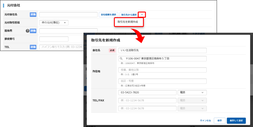 ※「保存して設定」または「保存」した取引先情報はデータベースに登録され、