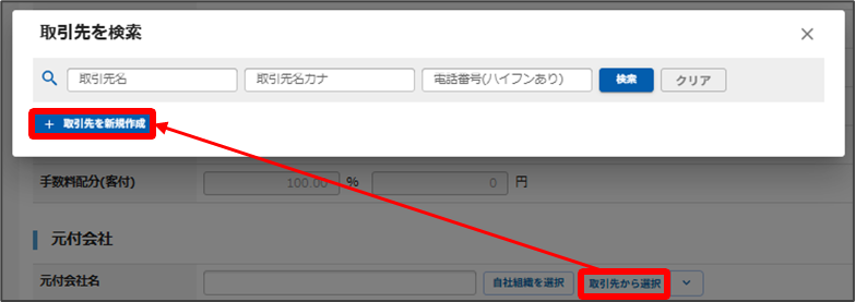 または「取引先から選択」>「+取引先を新規作成」より作成可能です。