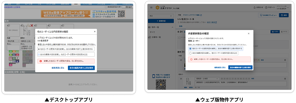 同じ物件を別画面で同時に編集していると、保存時に確認画面が表示されるようになります。