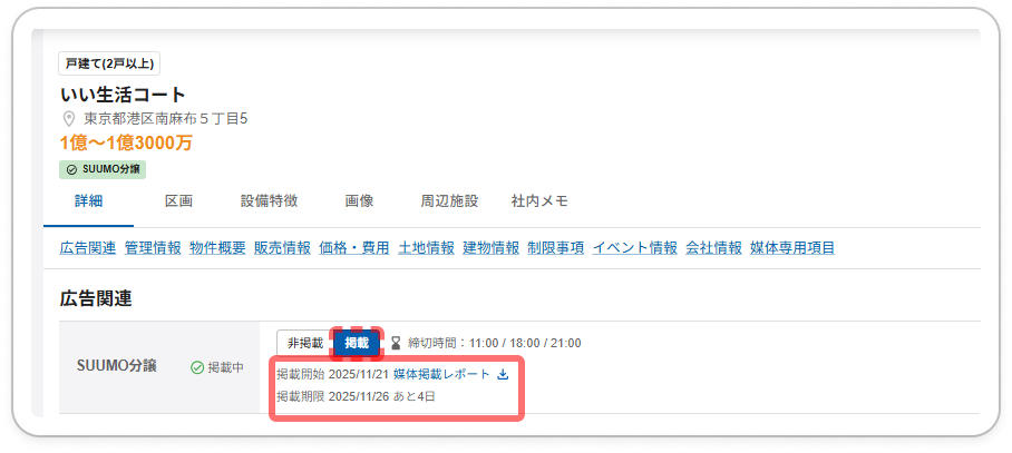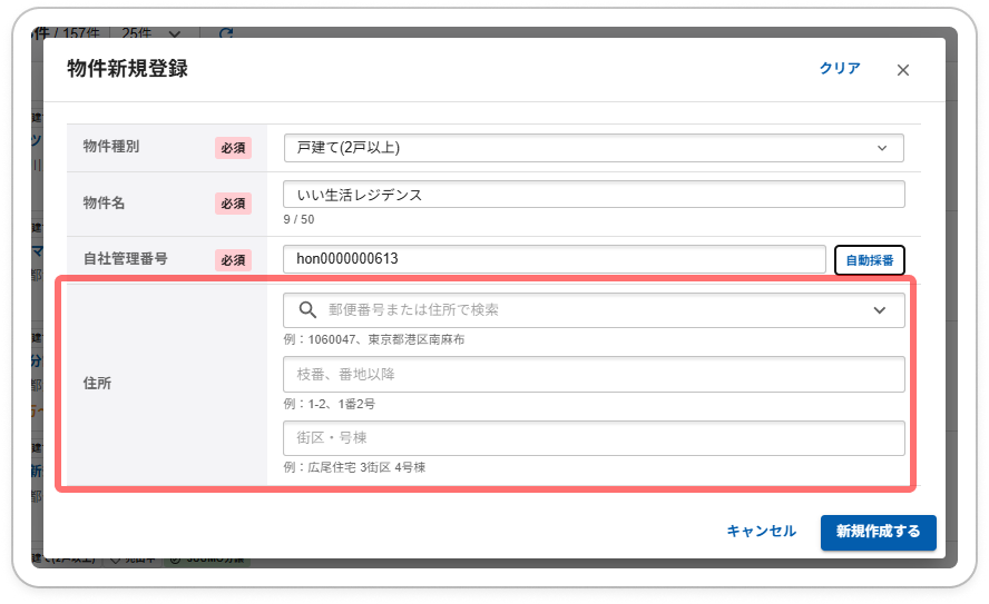 分譲物件の新規登録画面で、住所を登録できるようになります。