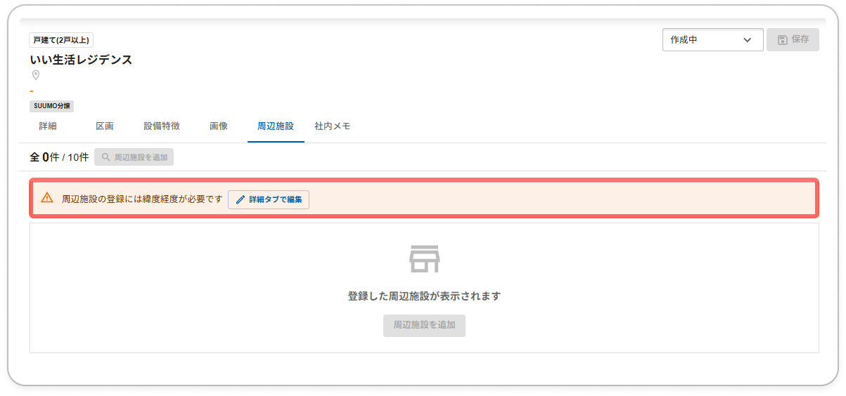 周辺施設の登録には、詳細タブ>所在地・ 緯度経度にて、「緯度経度」の入力が必要となっております。