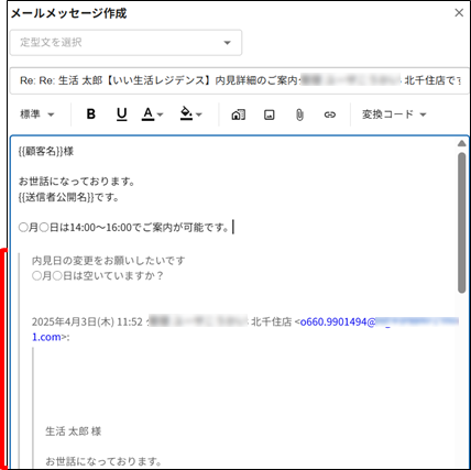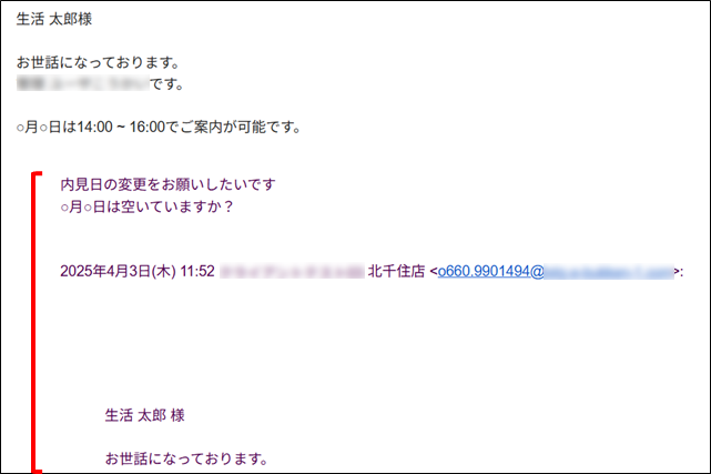 引用返信をご利用いただく際、過去のやりとりが入れ子構造で表示されるようになり、