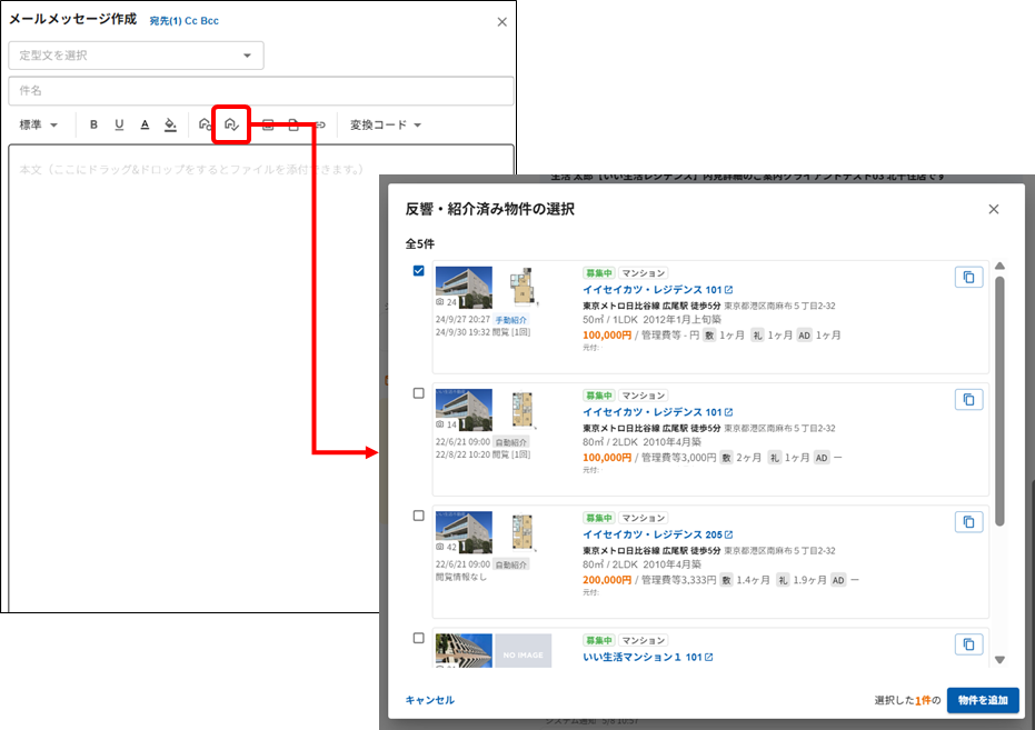 ※従来通り物件紹介ボタンから検索して挿入することも可能です。