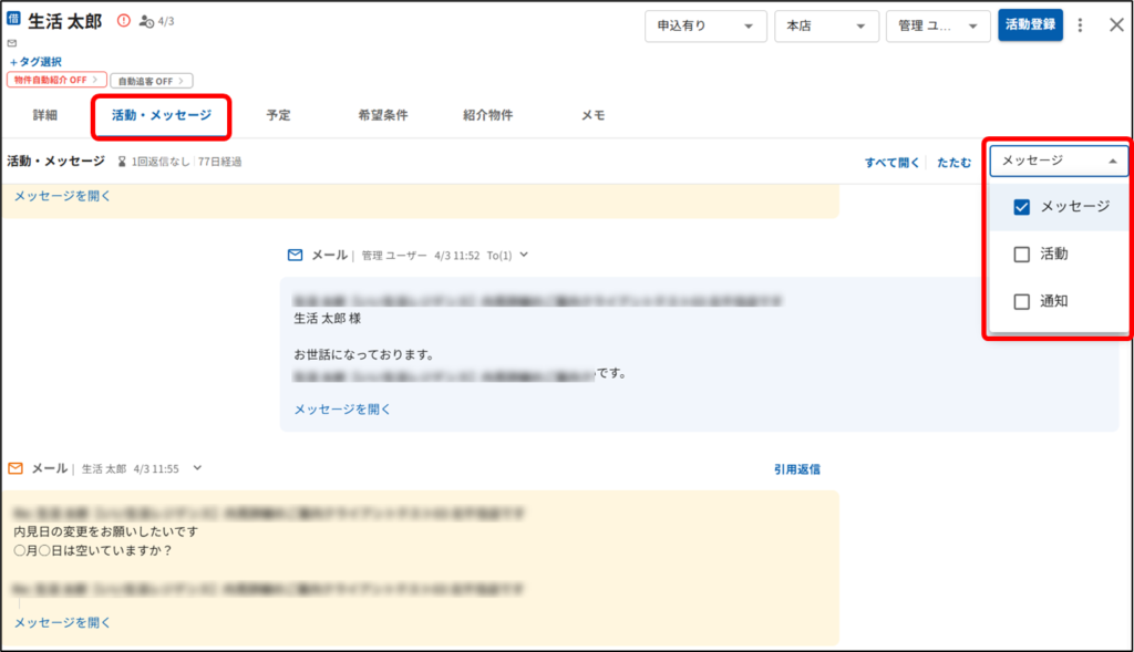 追客案件の「活動・メッセージ」メニューでは「メッセージ」「活動」「通知」のカテゴリ別に表示を切り替えられます。