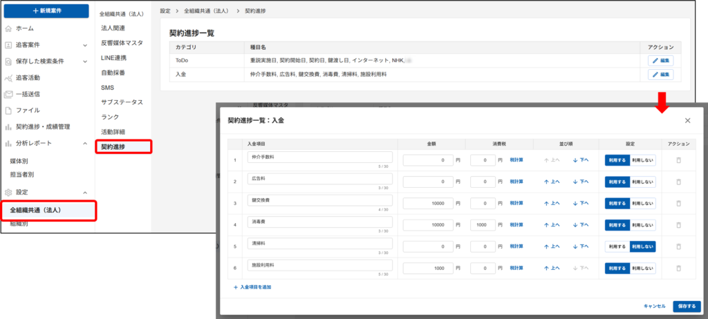 「契約進捗状況」の一覧に表示する「ToDo」と「入金」の項目を