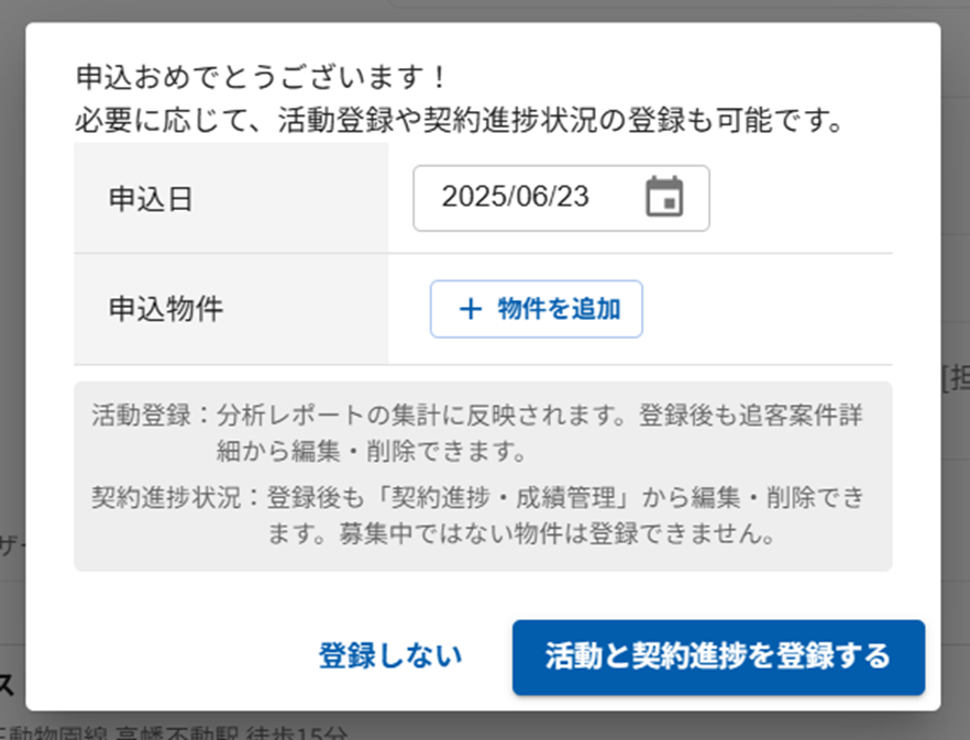 登録時には「申込日」「申込物件」を設定することが可能です。