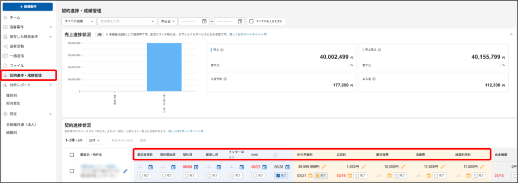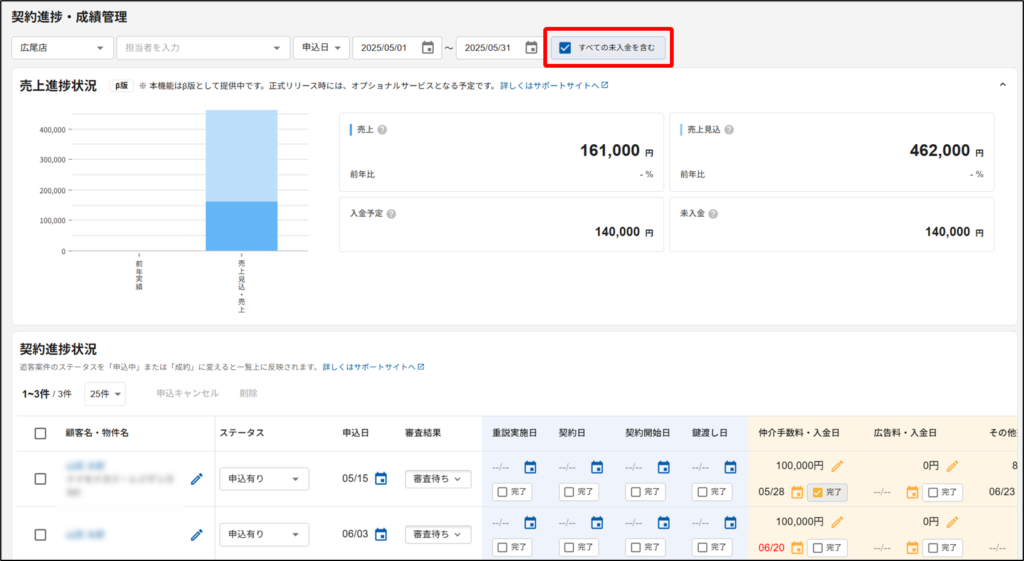・契約進捗状況:申込日の古い順に未入金のある案件が表示されます