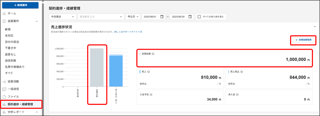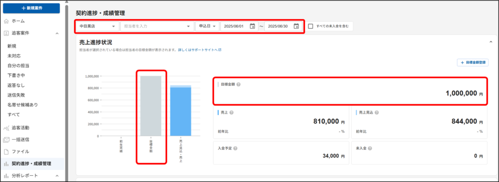 ※日付の絞り込みが「締め日」をまたぐ場合、関連する全ての月の目標金額が表示されます。
