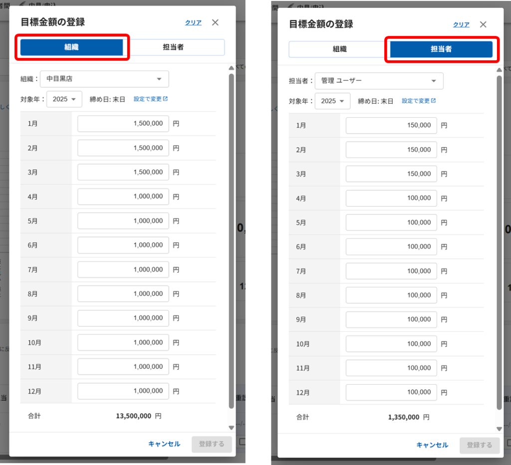 登録した目標金額は、画面上部で絞り込んでいる組織・担当者・日付をもとに
