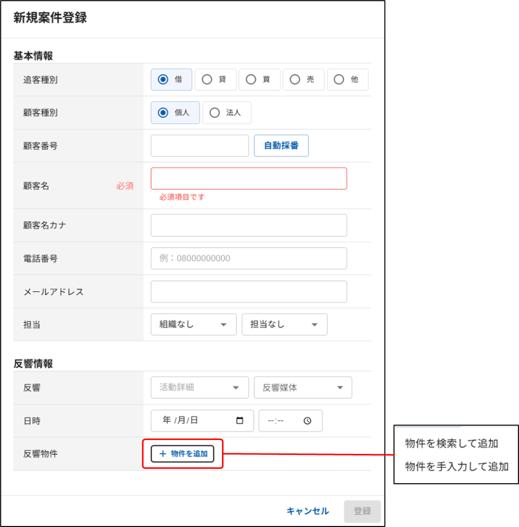 クラウド営業支援画面左上の「+新規案件」ボタンから追客案件を登録する際に