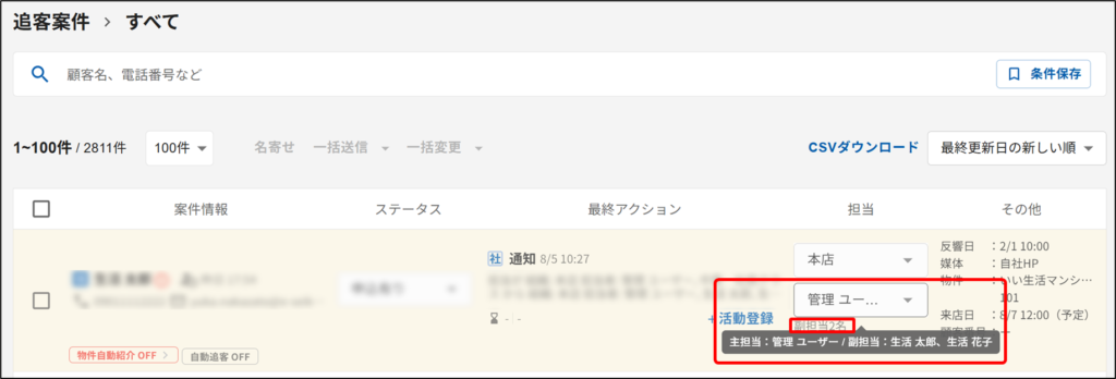 追客活動に紐づく副担当を確認・集計することができます。 本対応に伴い、CSV末尾に「副担当者」1~19の列を追加します。 追客案件(一覧)、追客案件CSVで副担当の確認が可能になります!