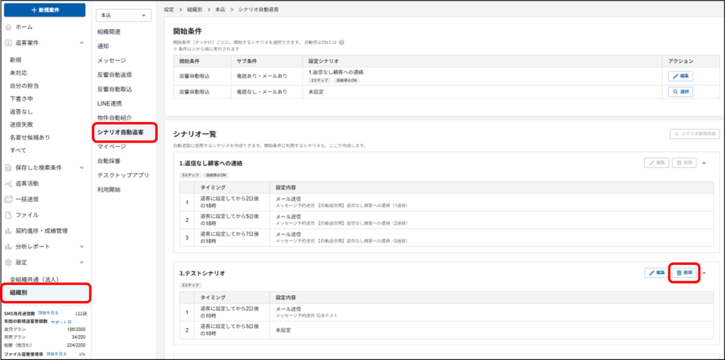[組織別>シナリオ自動追客>削除]から削除できます。