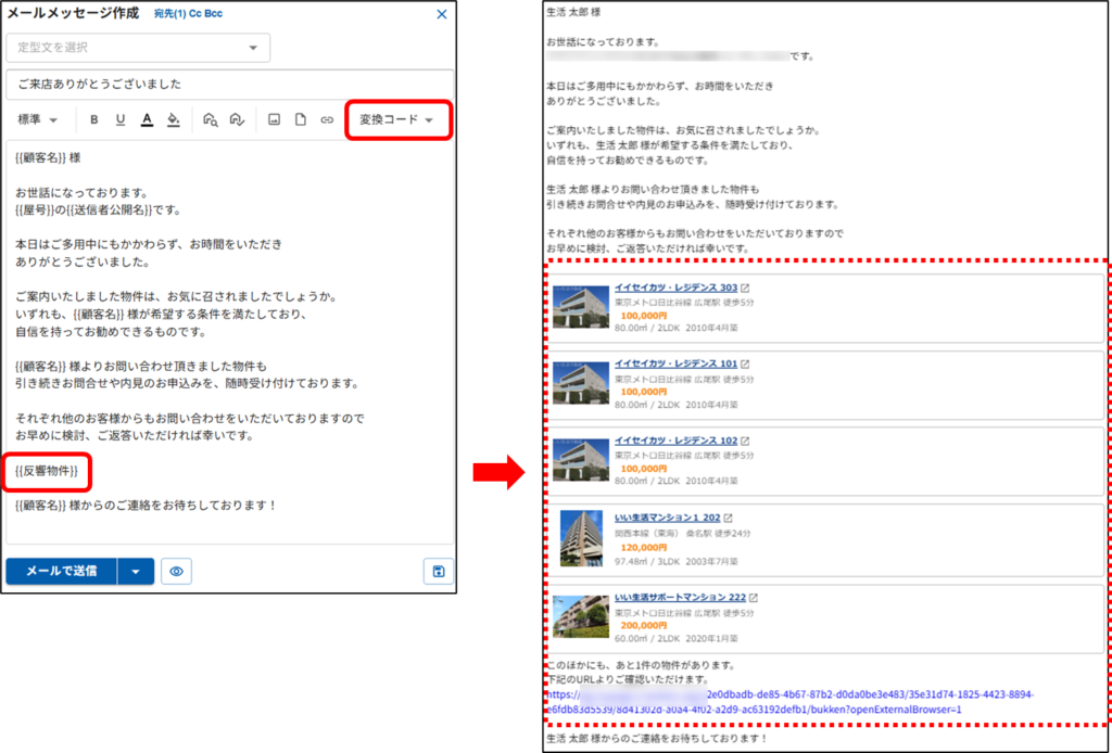 これにより、募集止めとなった反響物件についてもお客様へのメッセージに挿入することが可能になります。