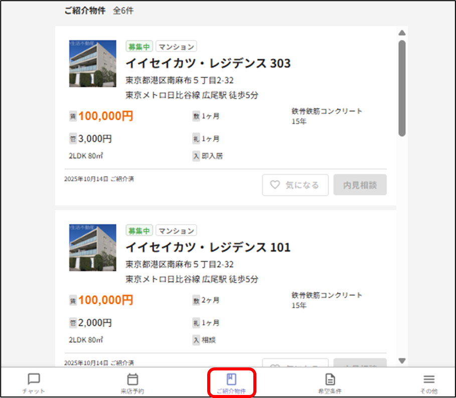 ※マイページURLを開いた際は、マイページのご紹介物件の画面に遷移します。