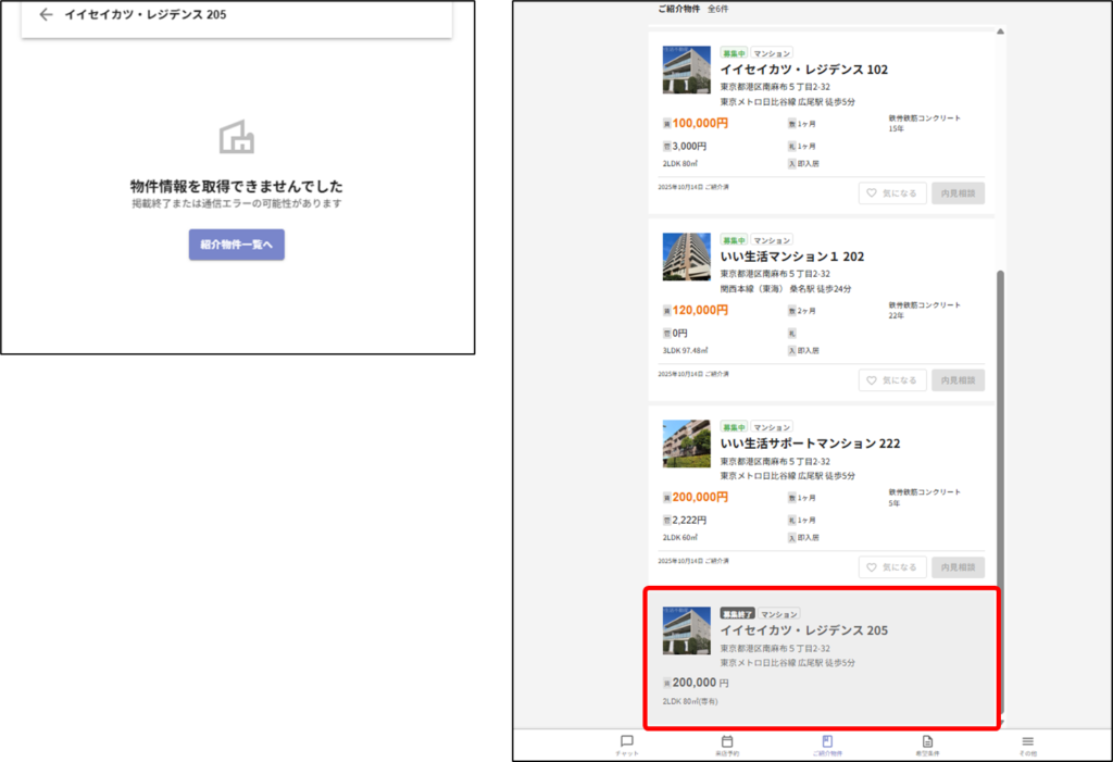 メッセージに挿入した募集止めの反響物件をクリックした際は、マイページ上で募集終了の旨が表示されます。