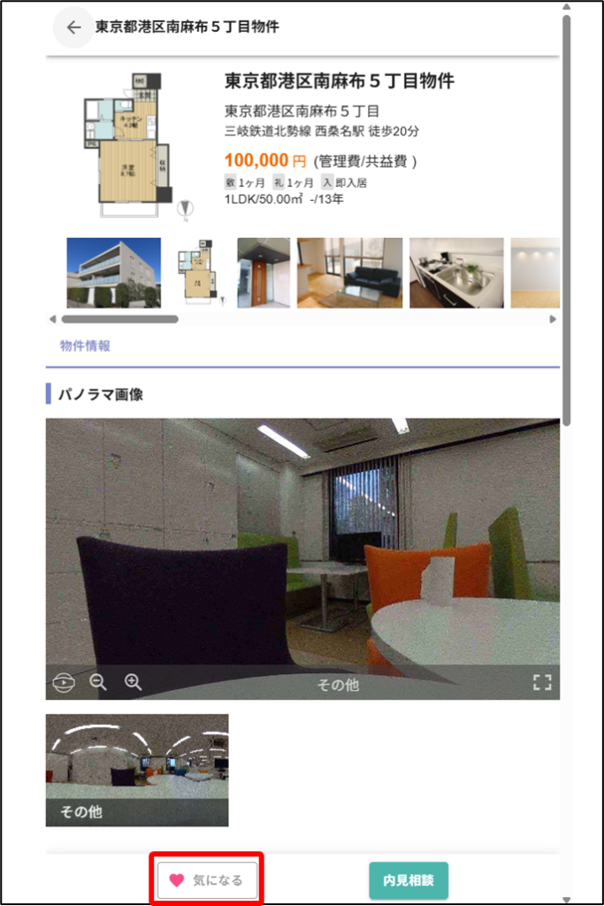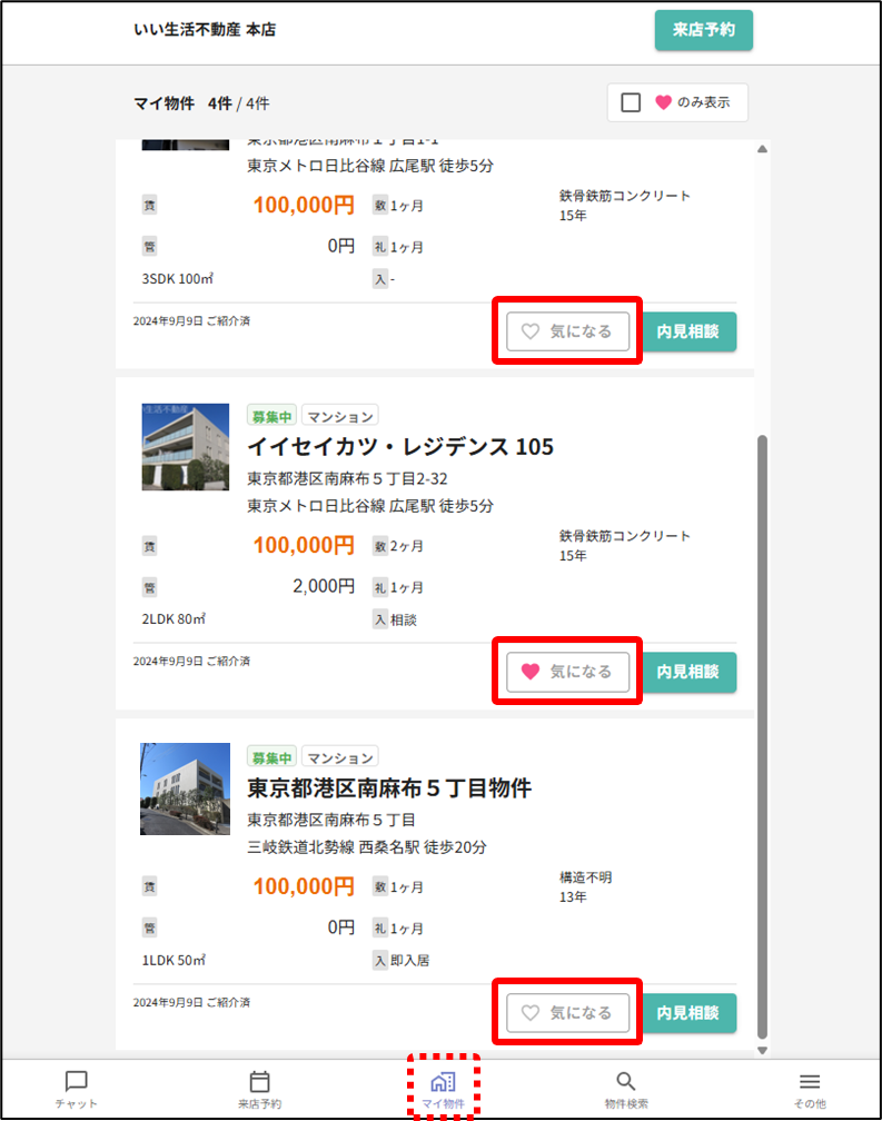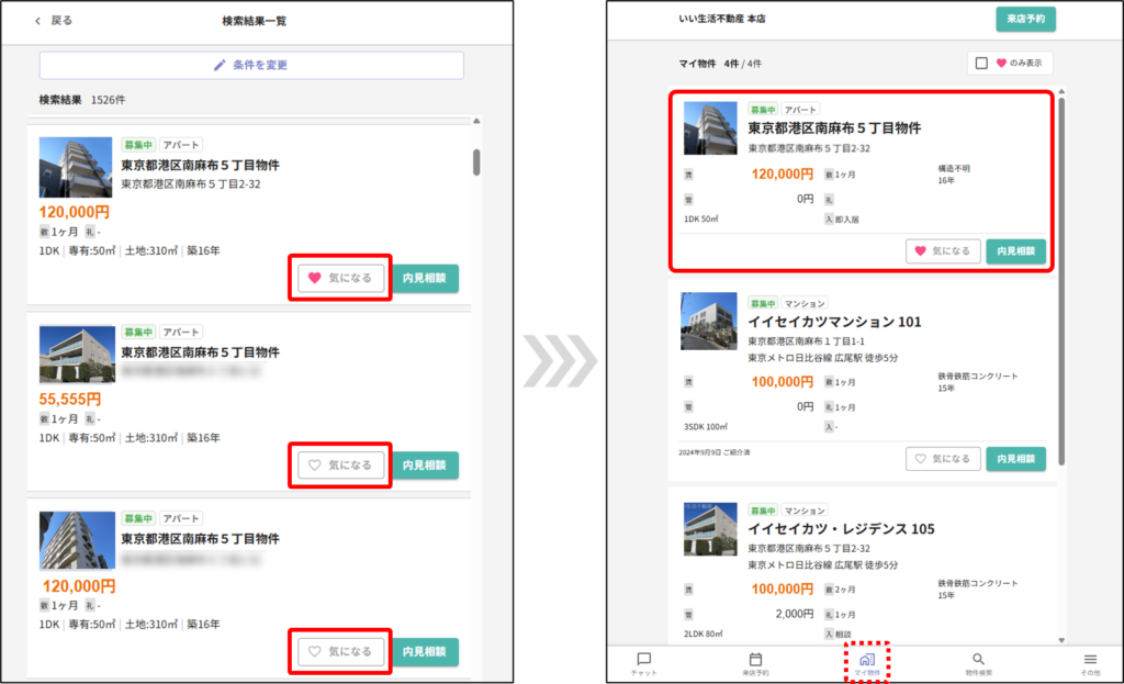 「気になる」ボタンを押した物件は「マイ物件」タブ(※旧:紹介物件タブ)に反映します。