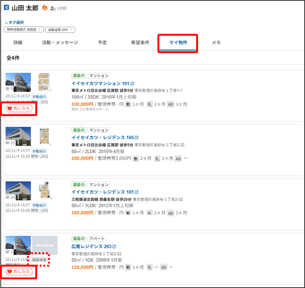 また、お客様自身で検索してお気に入り登録した物件は「顧客検索」タグが表示されます。