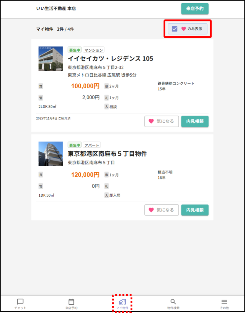 マイ物件の一覧右上の「♡のみ表示」にチェックすると、お気に入り登録した物件のみを確認できます。