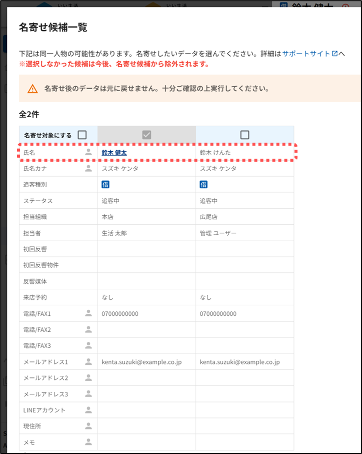 ※名寄せ実行時に名寄せ候補一覧の「氏名」から追客詳細を開くことができますが、