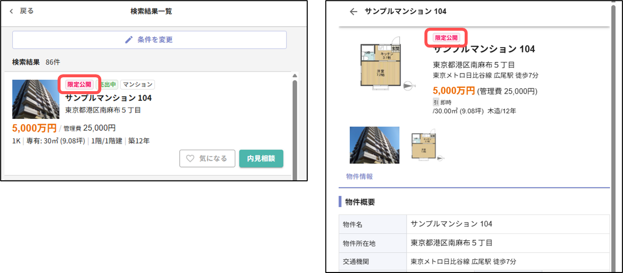 検索結果一覧・物件詳細に「限定公開」マークが表示されるようになります。