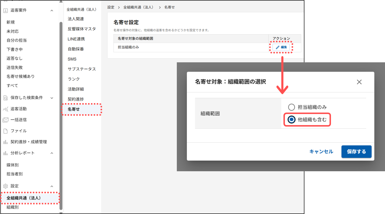 設定画面:設定>全組織共通(法人)>名寄せ>編集>「他組織も含む」にチェックして保存