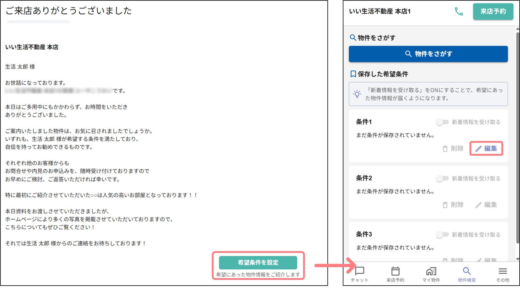 これまではマイページ遷移後にユーザー自身で希望条件の「編集」ボタンを押す必要がありましたが、