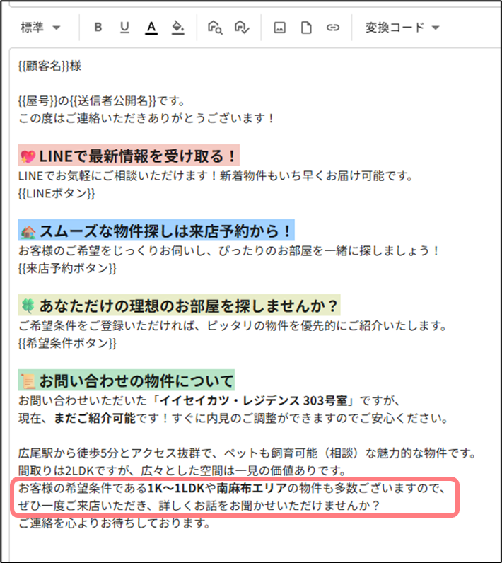 AIメッセージ機能において、お客様の希望条件が自動でメッセージに反映されるようになります。